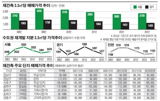 부동산114에 따르면 2002년 서울시내 재건축 아파트값은 3.3㎡당 평균 1630만원이었지만 2007년에는 3101만원으로 2배 가까이 껑충 뛰었다. 하지만 이듬해인 2008년 2743만원으로 떨어지더니 이후 약보합세가 이어지면 올들어 2720만원 선에 시세가 형성돼 있다.