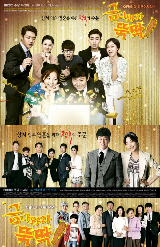 ‘금 나와라 뚝딱!’은 중산층의 허세와 실상을 풍자적으로 그려내며 가족과 결혼에 대한 의미를 생각하는 작품이다. 한지혜가 차갑고 도도한 유나와 밝고 긍정적인 몽희로 1인 2역을 소화하고 오랜만에 지상파 드라마를 통해 복귀하는 연정훈이 차갑고 까칠한 현수 역할에 캐스팅 됐다. 오는 6일 저녁 8시 40분 첫 방송된다.