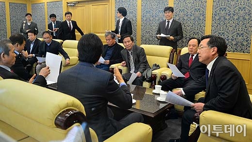 김기문 중소기업중앙회 회장(오른쪽)을 비롯한 관계자들이 4일 오전 경기도 파주시 경의선 남북출입사무소(CIQ)에서 북한이 개성공단 출경을 이틀째 불허한 것에 관련해 비공개 회의를 하고 있다. 방인권 기자 bink7119@