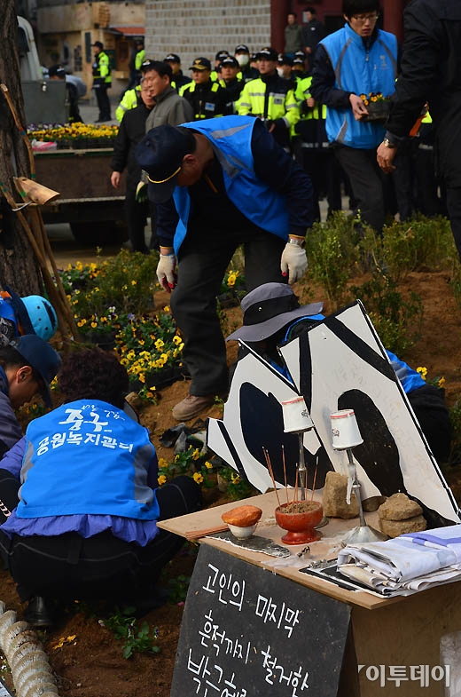 서울 덕수궁 대한문 앞에 설치된 쌍용자동차 해고 노동자들의 천막 농성장이 1년만에 철거된 가운데 5일 중구 공원녹지관리직원들이 화단을 설치하고 있다.