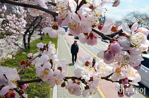 화창한 날씨를 보인 7일 서울 영등포구 여의도 윤주로에 홍매화가 꽃망울을 터뜨리고 있다. 방인권 기자 bink7119@