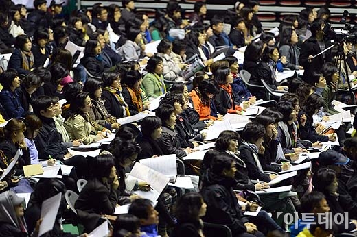 성균관대학교가 서울시 소재 주요 대학 중 처음으로 ‘2014년 단독 입시설명회’를 7일 오전 서울 송파구 잠실학생체육관에서 열었다. 이날 설명회에 참석한 학부모와 학생들이 김윤배 입학처장의 설명을 경청하고 있다. 방인권 기자 bink7119@