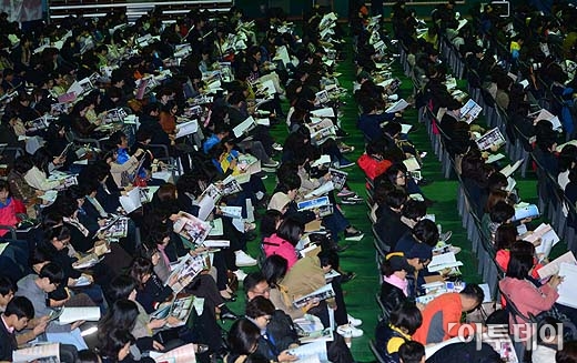 성균관대학교가 서울시 소재 주요 대학 중 처음으로 ‘2014년 단독 입시설명회’를 7일 오전 서울 송파구 잠실학생체육관에서 열었다. 이날 설명회에 참석한 학부모와 학생들이 입시자료를 보고 있다. 방인권 기자 bink7119@