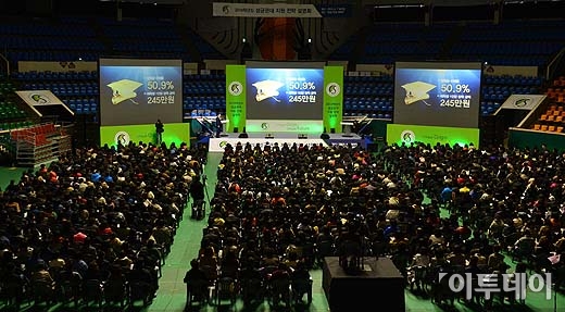 성균관대학교가 서울시 소재 주요 대학 중 처음으로 ‘2014년 단독 입시설명회’를 7일 오전 서울 송파구 잠실학생체육관에서 열었다. 이날 설명회에 참석한 학부모와 학생들이 김윤배 입학처장의 설명을 경청하고 있다. 방인권 기자 bink7119@