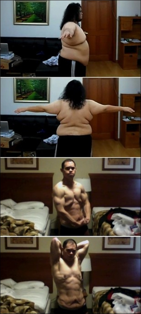 공개된 영상에는 150kg 나가는 뚱뚱한 청년이 근육질 몸매로 변하는 과정이 담겨 있다.