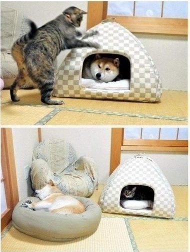 결국 개는 관심없는 듯 자신의 집을 포기한 채 고양이 집에서 잠을 청하고 고양이는 개의 집에서 편안한 포즈를 취하고 있다.