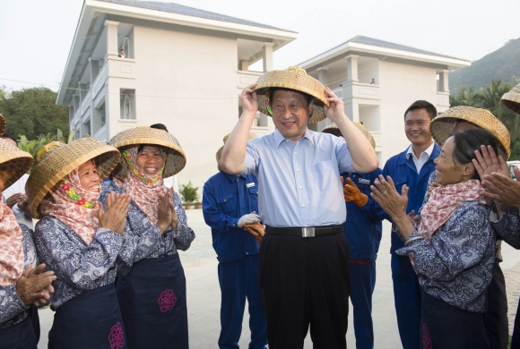 시진핑 중국 국가주석이 9일(현지시간) 하이난성 야룽베이에서 지역 주민들로부터 받은 대나무 모자를 써보고 있다. 시 주석은 10일까지 3일 동안 하이난성을 시찰했다. 하이난성/신화연합뉴스