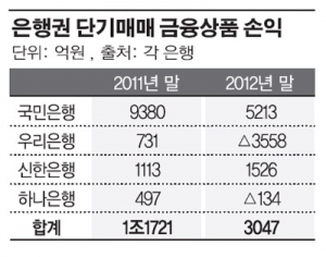 11일 금융권에 따르면 지난해 4개 시중은행(국민·우리·신한·하나)의 주식 및 파생상품(매매목적) 등 고위험 금융상품 투자 관련 이익은 3047억원으로 2011년(1조1721억원)과 비교해 무려 74.0%(8600억원) 급감했다.