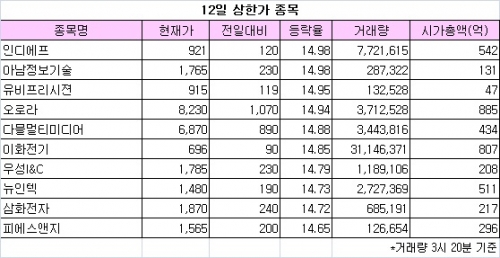 12일 한국거래소에 따르면 유가증권시장 2개종목 코스닥 8개 종목 등 총 10개 종목이 상한가를 기록했다.