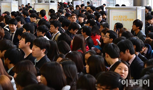 '2013 KB굿잡 우수기업 취업박람회'가 15일 서울 삼성동 코엑스에서 열린 가운데 행사장이 많은 구직자와 관계자들로 붐비고 있다. 양지웅 기자 yangdoo@