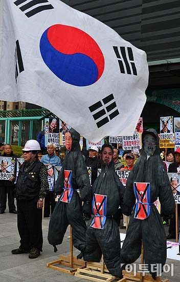 대한민국 어버이연합 등 보수단체 회원들이 15일 오후 서울 광화문 KT앞에서 ‘보수대연합 출범식 및 태양절 규탄 기자회견’을 열고 있다. 방인권 기자 bink7119@