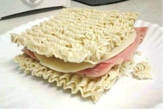 사진 속에는 빵 대신 라면 두 개 사이에 햄과 치즈를 넣은 샌드위치가 찍혀 있다.