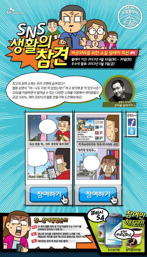 이 미션은 SK텔레콤 공식 페이스북을 통해 누구나 참여가 가능하며, 미션 종료 후 김양수 작가가 직접 심사해 우수상 1명에게 갤럭시S4, 참가한 소셜팬 중 추첨을 통해 200명에게 던킨도너츠 커피&도넛 세트 제공 등 경품을 증정한다.