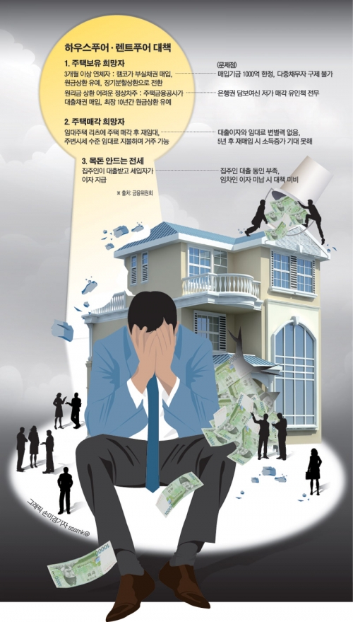 또 연체는 없지만 원리금 상환이 어려운 경우 주택금융공사가 대출채권을 매입해 최장 10년간 원금상환을 유예해 주고 그 기간 동안 은행 대출금리 수준의 이자만 내도록 했다. 하우스푸어 등의 지원으로 총 1조1000억원이 투입된다.