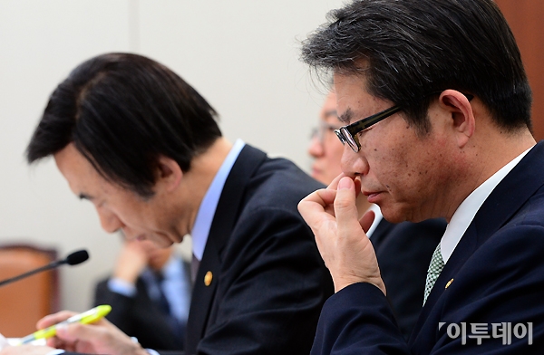 류길재 통일부 장관과 윤병세 외교부 장관이 17일 오전 국회 외교통일위원회 전체회의에서 법안 자료를 검토하고 있다. 노진환 기자 myfixer@