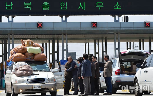 개성공단기업협회 회장단의 방북 신청이 거부됐다. 방북 허가를 받지 못한 회장단이 17일 경기도 파주 남북출입사무소에서 입경하는 개성공단 직원들과 포옹을 나누고 있다. 양지웅 기자 yangdoo@