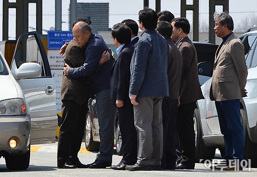 개성공단기업협회 회장단의 방북 신청이 거부됐다. 방북 허가를 받지 못한 회장단이 17일 경기도 파주 남북출입사무소에서 입경하는 개성공단 직원들과 포옹을 나누고 있다. 양지웅 기자 yangdoo@