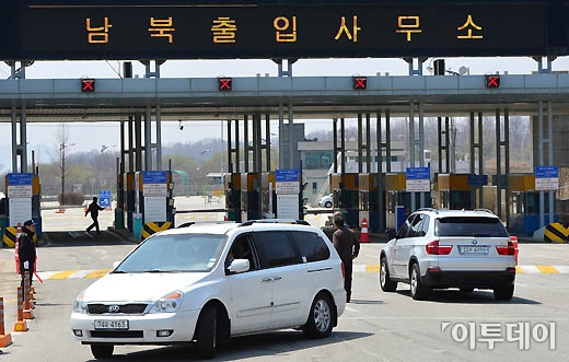 개성공단기업협회 회장단의 방북 신청이 거부됐다. 방북 허가를 받지 못한 회장단의 차량이 17일 경기도 파주 남북출입사무소 게이트에서 유턴하고 있다. 양지웅 기자 yangdoo@