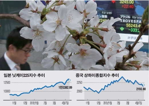 일본증시 닛케이225지수는 올들어 28% 오른 반면 중국증시 상하이종합지수는 3% 이상 하락했다.