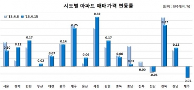 지역별로는 △세종(0.32%) △경북(0.27%) △대구(0.25%) △인천(0.17%) △강원(0.17%) 등이 상승한 반면, 제주(-0.07%), 전남(-0.03%)은 하락했다.