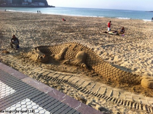 사진에는 해변가의 모래로 만들어진 용의 형상이 담겨 있다. 세심한 무늬와 곡선을 제대로 살려 하나의 예술 작품을 보는 듯 하다.
