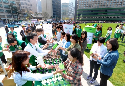 이날 행사는 서울광장에서 진행됐으며 일회용컵 사용을 자제하고 커피 찌꺼기를 재활용하자는 메시지를 전달했다. 서울시는 연중 도시 녹화 캠페인인 ‘서울, 꽃으로 피다’ 활동을 진행하고 있으며 22일 ‘지구의 날’을 기념하는 의미로 스타벅스가 함께했다.