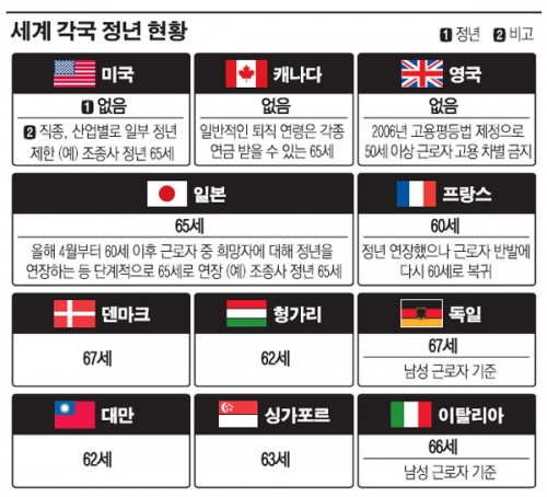 아시아 국가들도 정년 연장 대열에 합류했다. 대만의 법정 정년은 62세, 싱가포르는 63세로 한국보다 높으며 두 국가 모두 장기적으로 정년을 더 늘리는 방안을 검토하고 있다.