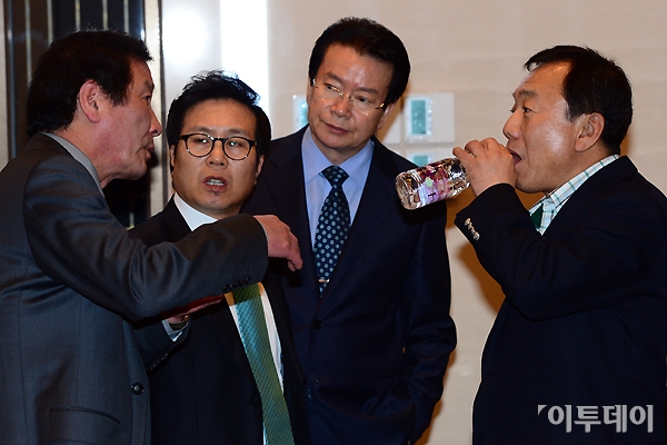 북한이 개성공단 통행을 제한한지 21일째를 맞는 23일 오후 여의도 중소기업중앙회에서 개성공단 정상화를 위한 긴급 간담회가 열렸다. 한재권 개성공단기업협회장(오른쪽)과 입주 기업 대표들이 심각하게 이야기를 나누고 있다. 노진환 기자 myfixer@