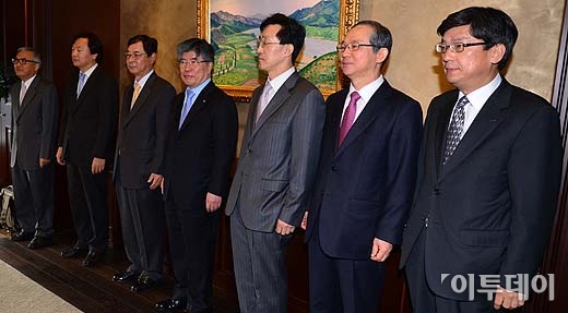 김중수 한국은행 총재가 24일 오전 서울 중구 남대문로 한국은행 본관에서 열린 경제동향간담회에서 참석자들과 기념촬영을 하고 있다. 이날 간담회에는 강태영 포스코경영연구소장, 박상규 대한건설협회 상근부회장, 박원암 홍익대학교 교수, 신인석 중앙대학교 교수, 양준철 한국반도체산업협회 상근부회장, 이성한 국제금융센터 원장 등이 참석했다. 방인권 기자 bink7119@