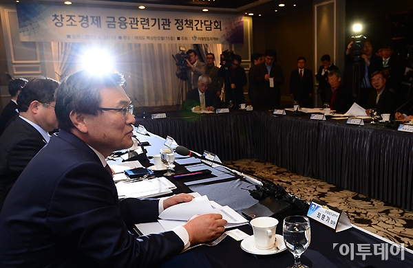 최문기 미래창조과학부 장관이 24일 오후 여의도 렉싱턴 호텔에서 열린 창조경제 금융관련기관 정책간담회에 참석해 모두발언을 하고 있다. 노진환 기자 myfixer@