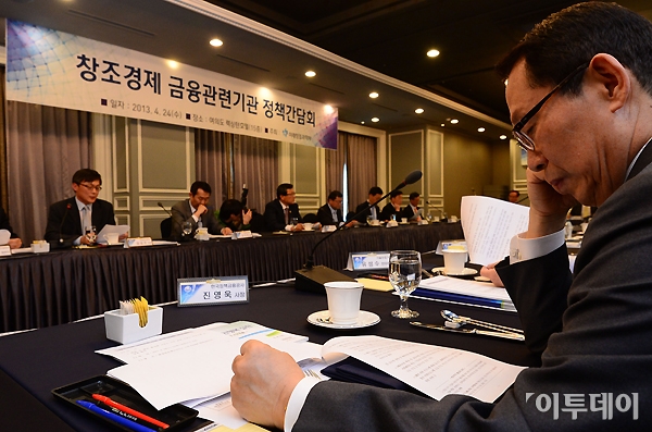 창업 및 벤처 활성화를 위해 열린 ‘창조경제 금융관련기관 정책간담회’가 최문기 미래창조과학부 장관 주재로 24일 오후 여의도 렉싱턴호텔에서 열렸다. 간담회에서 한 참석자가 회의 자료를 살펴보고 있다. 노진환 기자 myfixer@