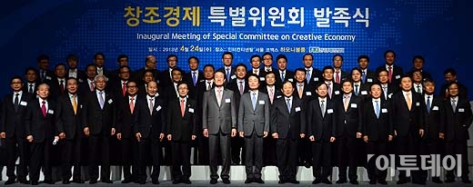 허창수 전경련회장과 한선교 국회 미래창조과학방송통신위원회 위원장 윤종록 미래창조과학부 제 2차관을 비롯한 기업인들이 24일 오후 서울 강남구 삼성동 인터컨티넨탈호텔에서 열린 ‘창조경제 특별위원회 발족식’에 앞서 기념촬영을 하고 있다. 방인권 기자 bink7119@