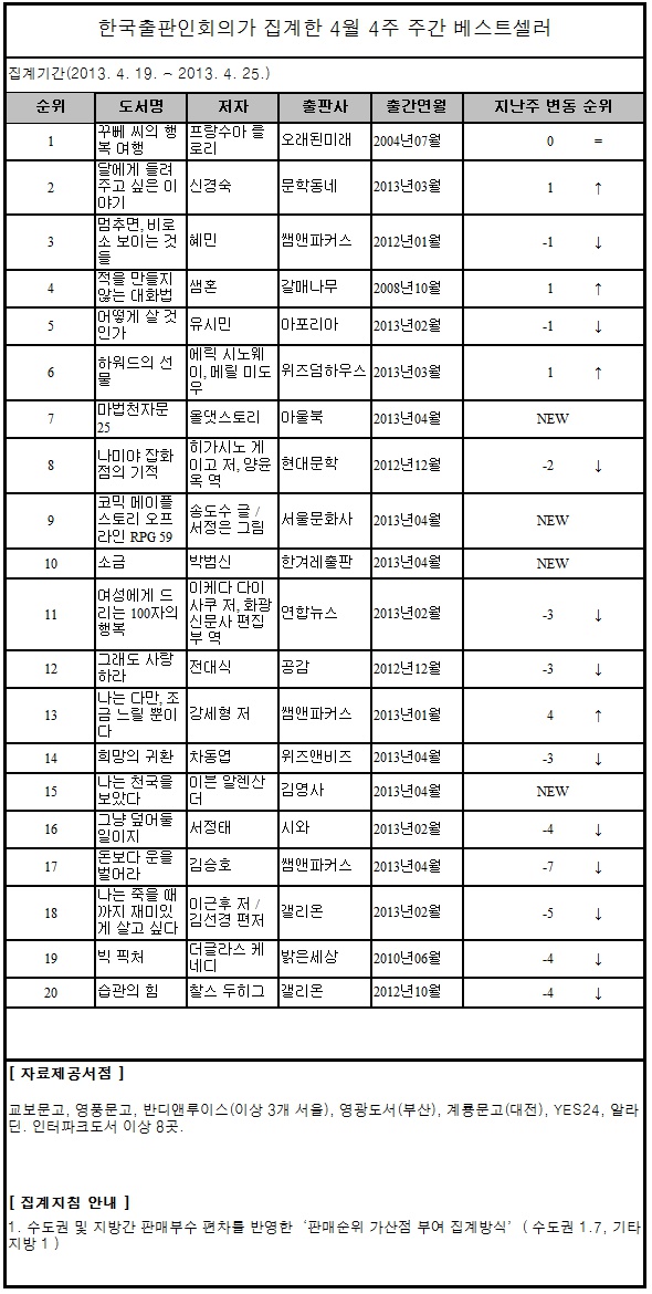 25일 한국출판인회의가 집계, 발표한 자료에 따르면 프랑수와 를로리가 지은 ‘꾸뻬 씨의 행복 여행’이 도서 1위를 차지했다. 지난 19일부터 25일까지 기간 동안 집계한 자료다.