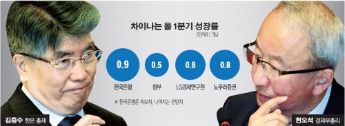 앞서 한은은 4월 기준금리를 동결한 이후 거센 비난에 직면했다. 지나치게 낙관적인 경기 전망에 근거해 현실을 통화정책에 제대로 반영하지 못한다는 비난과 함께 정부의 경기부양 정책에 찬물을 끼얹었다는 비판이었다. 정부의 신경전이 계속되는 가운데 이런 가운데 이날 경제성장률 발표로 일단은 한은에 힘이 실리는 모습이다.