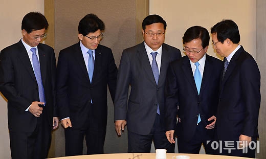경제5단체 부회장들이 26일 서울 중구 플라자호텔에서 경제현안 관련 긴급회동을 갖고 있다. 왼쪽부터 김무한 한국무역협회 전무, 송재희 중소기업중앙회 부회장, 김영배 한국경영자총협회 부회장, 이동근 대한상공회의소 부회장, 이승철 전국경제인연합회 부회장. 양지웅 기자 yangdoo@