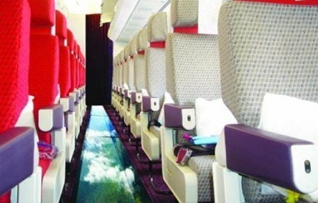 공개된 사진 속에는 비행기 내부 승객통로 바닥이 유리로 돼 있어 눈길을 끈다. 특히 유리로 된 바닥 밑으로