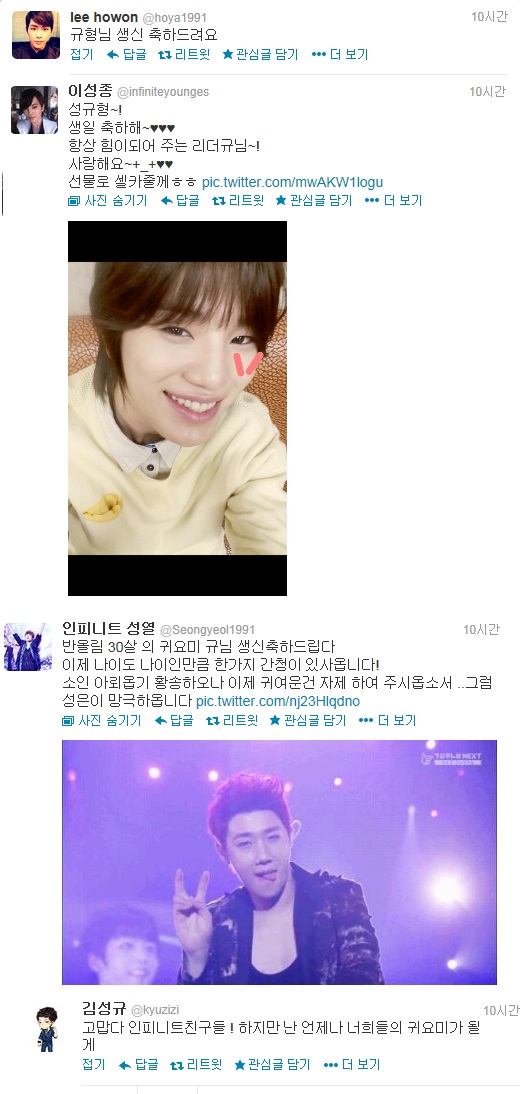 또 다른 멤버 성열은 28일 "반올림 30살의 귀요미 규님 생신 축하드립니다. 이제 나이도 나이인만큼 한 가지 간청이 있사옵니다. 소인 아뢰옵기 황송하오나 이제 귀여운 건 자제해 주시옵소서. 그럼 성은이 망극하옵나이다"라고 성규에게 전했다.