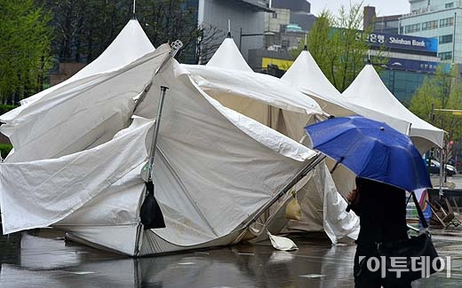 강한 바람과 함께 시간당 20mm 수준의 많은 비가 내리는 29일 오전 서울 청계광장에서 시민들이 우산으로 비바람을 피하며 출근길을 재촉하고 있다. 방인권 기자 bink7119@