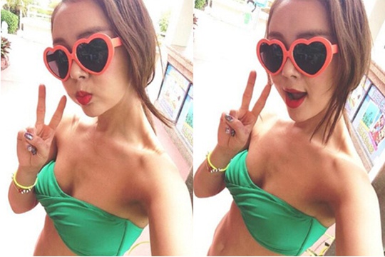 사진 속 백보람은 특유의 구릿빛 피부의 가녀린 몸매와 녹색 비키니를 입고 포즈를 취하고 있다. 얼굴을 가릴만큼 큰 크기의 하트 선글라스와 빨간색 립스틱은 백보람의 패셔니스타 기질을 여실히 보여준다.