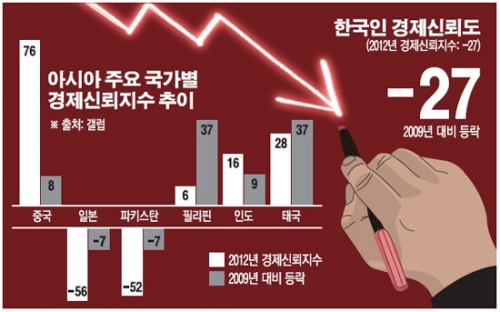 미국 여론조사 전문업체인 갤럽은 한국의 경제신뢰지수(ECI)가 지난해 -27로, 일본(-56)과 파키스탄(-51)에 이어 아시아 16국 중 13번째를 기록했다고 지난달 30일(현지시간) 밝혔다.