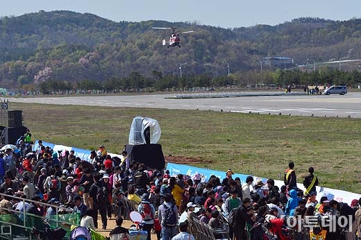 ‘2013경기안산항공전’이 1일 오전 경기 안산시 상록구 경기테크노파크 앞에서 열렸다. 근로자의 날을 맞아 나들이 나온 가족들이 소방헬기의 이착륙을 지켜보고 있다.