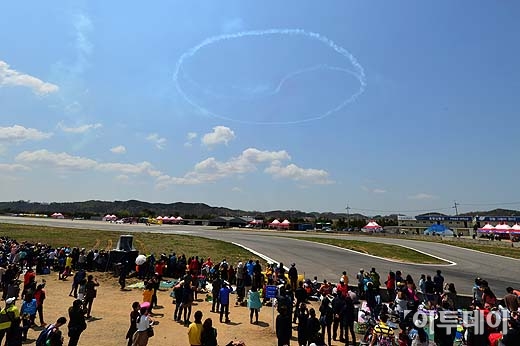 ‘2013경기안산항공전’이 1일 경기 안산시 상록구 경기테크노파크 앞에서 열렸다. 행사에 참가한 대한민국 공군 특수비행팀 블랙이글스가 관람객들에게 멋진 에어쇼를 선보이고 있다.