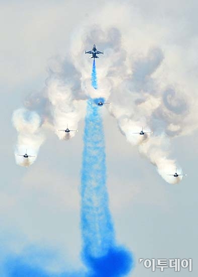 ‘2013경기안산항공전’이 1일 경기 안산시 상록구 경기테크노파크 앞에서 열렸다. 행사에 참가한 대한민국 공군 특수비행팀 블랙이글가 관람객들에게 멋진 에어쇼를 선보이고 있다.
