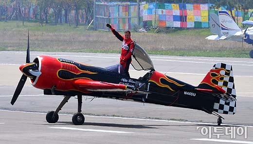 ‘2013경기안산항공전’이 1일 경기 안산시 상록구 경기테크노파크 앞에서 열렸다. 행사에 참가한 미국 대표 파일럿 허비톨슨이 관람객들에게 멋진 에어쇼를 선보인 뒤, 인사를 하고 있다.