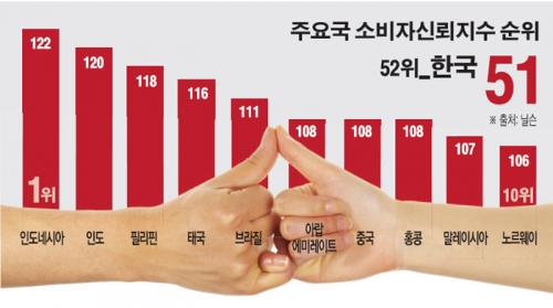 시장연구조사기관 닐슨이 1일(현지시간) 발표한 보고서에 따르면 한국의 소비자신뢰지수는 51로 전분기 대비 13포인트 상승했다. 이는 조사 대상 58국 평균인 93에 크게 미치지 못하는 것이다. 한국의 지난해 4분기 신뢰도지수는 38이었다.
