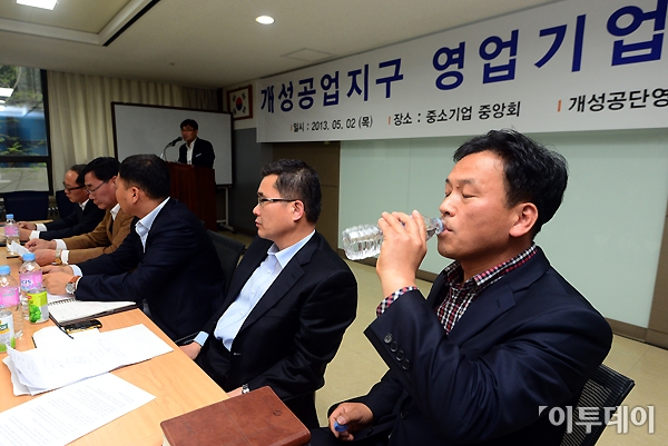 정부가 2일 개성공단 입주기업들을 대상으로 기급 유동성 지원을 위해 총 3천억 원 규모의 ‘개성공단 기업 긴급자금’을 지원하기로 했다. 이날 오후 여의도 중소기업중앙회에서 열린 개성공업지구 영업기업 간담회에 참석한 영업소 관계자가 물을 마시고 있다. 노진환 기자 myfixer@