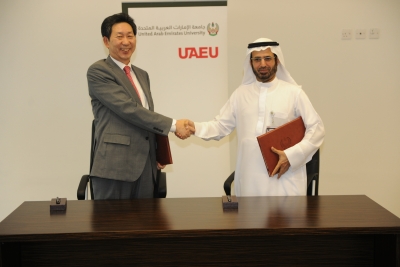 단국대학교는 최근 아랍에미리트(UAE) 대학과 학생 및 학술교류협정을 체결했다고 2일 밝혔다. 장호성(왼쪽) 단국대 총장이 지난 1일 아랍에미리트(UAE)를 방문해 아랍에미리트 대학 부총장인 알리 라시드 알 노아이미 박사와 협약서에 서명 후 기념촬영을 하고 있다.