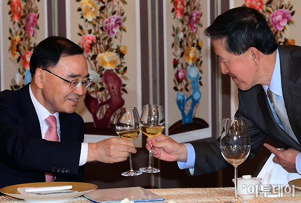 정홍원 국무총리와 허창수 전경련 회장이 2일 오후 소공동 롯데호텔에서 열린 전경련 회장단회의 만찬회에서 건배를 하고 있다. 노진환 기자 myfixer@