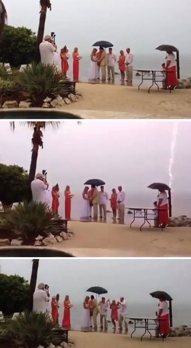 영상에는 외국의 한 신랑-신부가 바닷가에서 결혼식을 진행하고 있는 모습이 담겨 있다. 신랑과 신부는 평화로운 분위기 속에서 예식을 진행하고 있지만, 이내 하늘이 어두워지더니 비가 쏟아지기 시작했다. 이후 천둥·번개가 치기 시작하면서 결혼식장은 아수라장이 됐다.