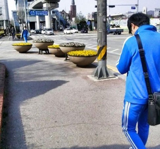 사진 속에는 파란색 트레이닝복을 입은 남자가 고개를 숙이고 핸드폰을 보며 길을 걷고 있다. 그런데 걸어가는 방향에서 남자와 똑같은 파란색 트레이닝복을 입은 다른 남자가 걸어오고 있다.